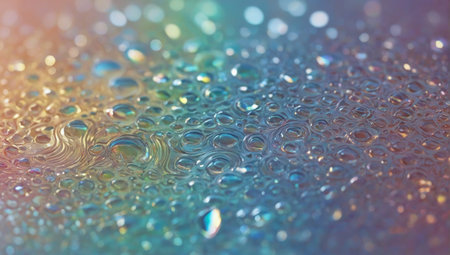 A macro photograph of soap bubbles in water, creating mini waves that reflect a spectrum of colors