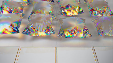 Metal square tiles transform into flying transparent pillows. Light refraction. Diamond. 3d illustration. High quality 3d illustration