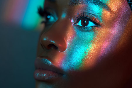 Close up of a beautiful African American woman with holographic makeup and colorful reflections