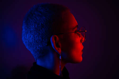 Portrait of beautiful young woman with short hair wearing glasses in neon light