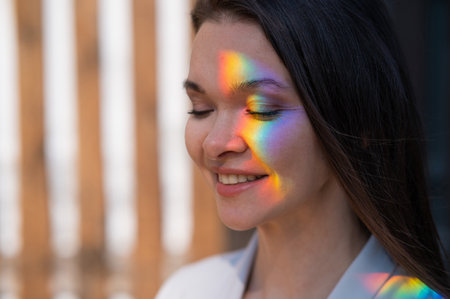 Portrait of caucasian woman with rainbow beam on her face outdoors.