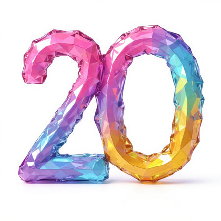 Greeting card for 20 years. Celebrate a 20th birthday with vibrant, multicolored numbers made from shiny, gem-like pieces.