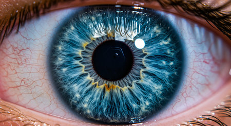 Detailed view of a human eye with a striking blue iris, showcasing the intricate patterns and textures of the iris.