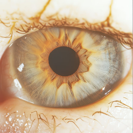 a close-up of an eye's iris, highlighting the complex fibrous structures and the gradations of color radiating from the pupil