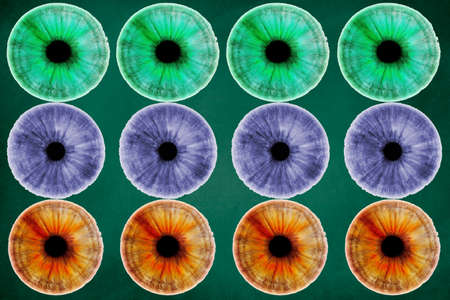 Abstract eyes of different colors on a green background