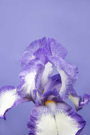 Close up of purple and white iris flower on purple background. Monochrome trendy color, copy space
