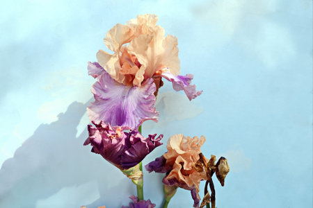 Blooming iris on bright paper background.