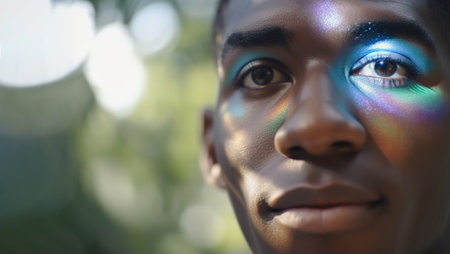 African man with multicolored shadows on his eyelids and glitter. Happy transgender black man outdoors, sunshine. Closeup portrait, copy space. Generative AI
