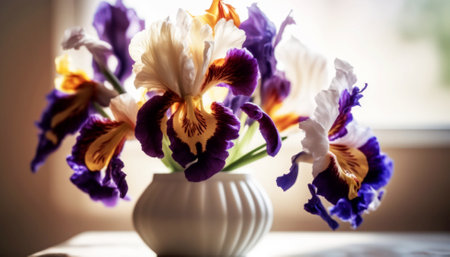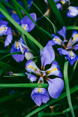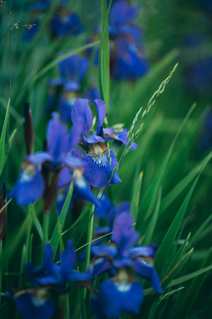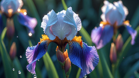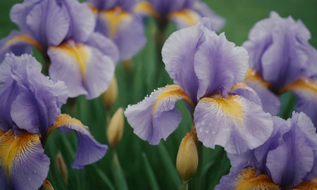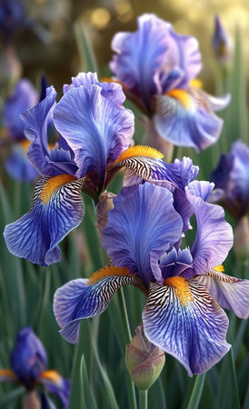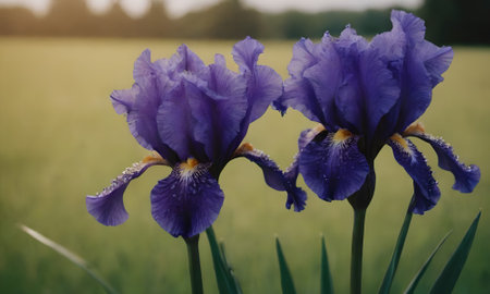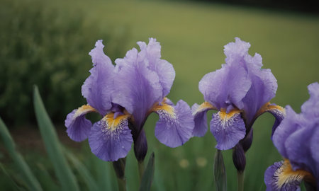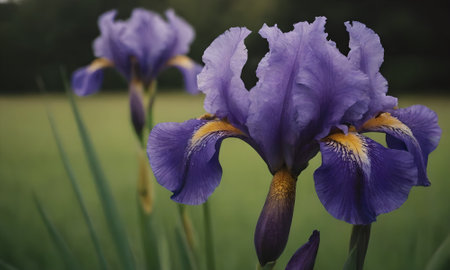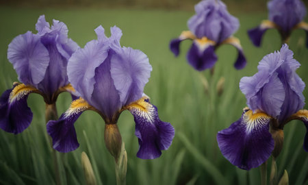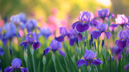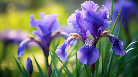 Beautiful blooming irises in a vibrant garden. A serene moment captured in nature with delicate irises swaying gently in the breeze. The elegance of irises symbolizing renewal in the cycle of life.