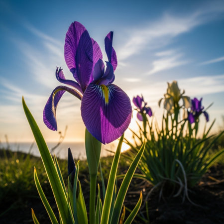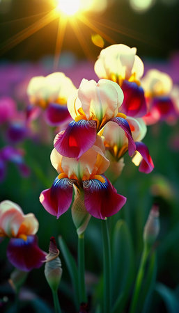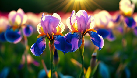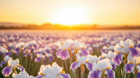 A breathtaking view of blooming iris flowers in a sunlit field at sunrise, showcasing vibrant petals under the warm glow of the early morning sky.