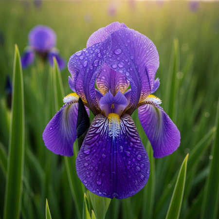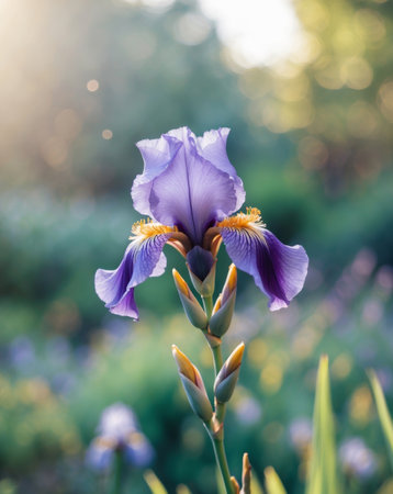 AI Generated. Elegant purple iris flower blooming in a vibrant garden setting with soft sunlight