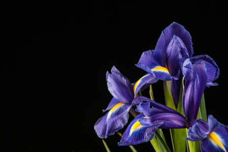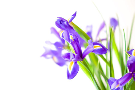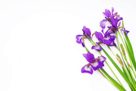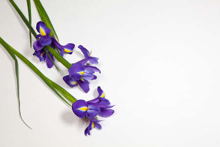 Beautiful violet iris flowers on a white background. Minimalist floral composition.