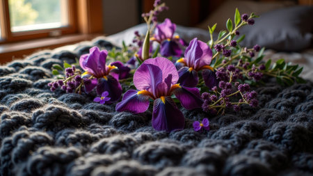 Vibrant purple irises on textured gray blanket in sunny room. That the image is generated using AI.