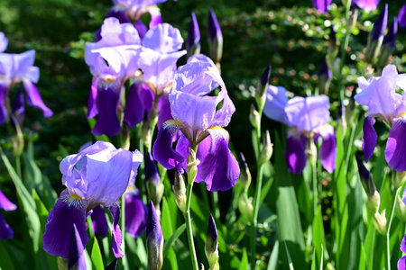 Light purple iris flowers with soft petals and green stalks in natural garden setting