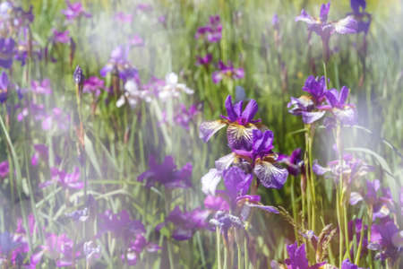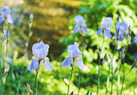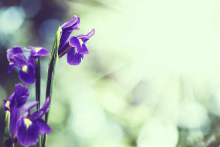 Blue flower irises- nature spring sunny . Soft focus with bokeh