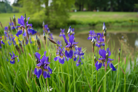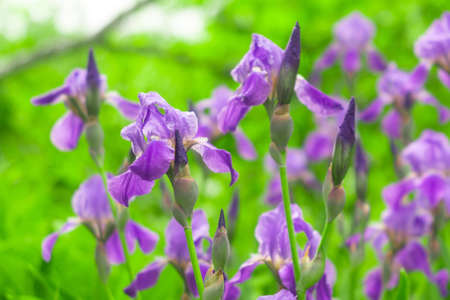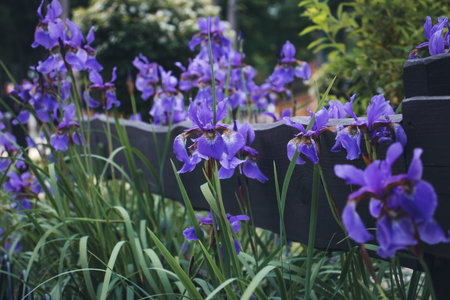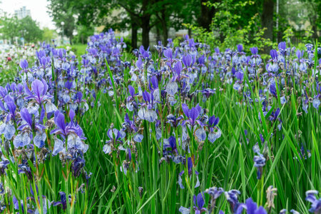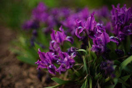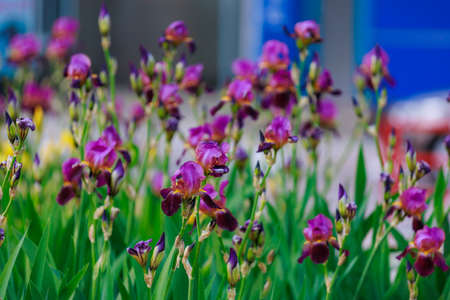 Iris flowers with selective focus on a blurred background of a flower bed. Copy space for text. Landscaping and decoration of the urban environment and garden plot