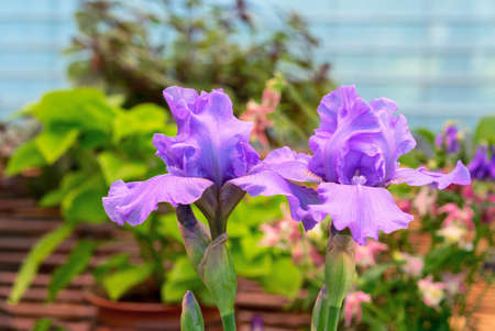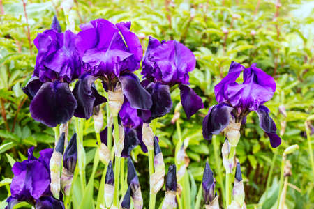 Close-up of purple iris flowers. Lots of irises. Large cultivated flowers of bearded iris Iris germanica. Pink purple iris flowers grow in the garden