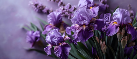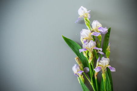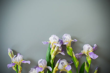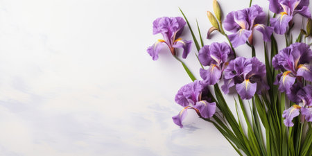 Purple bouquet of iris flowers on a light background. Place for text, festive spring background.