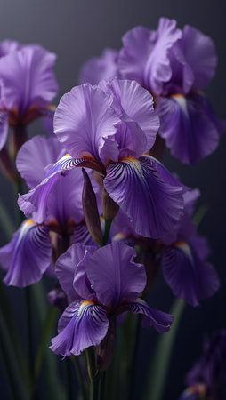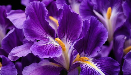 AI Generated. Closeup of deep purple irises in full bloom on dark purple background