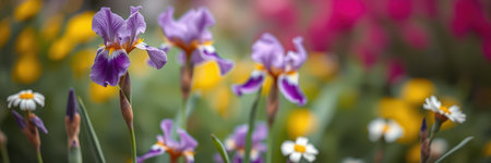 Vibrant purple irises blooming in a sunny garden filled with colorful flowers during spring season