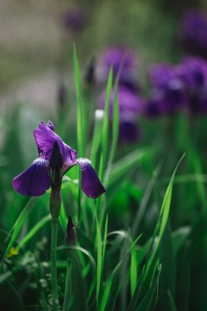 Beautiful purple Iris flower in the spring garden. Selective focus.