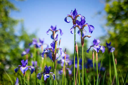 Siberian iris in spring garden. Group of blooming Siberian irises (iris sibirica) in the garden.