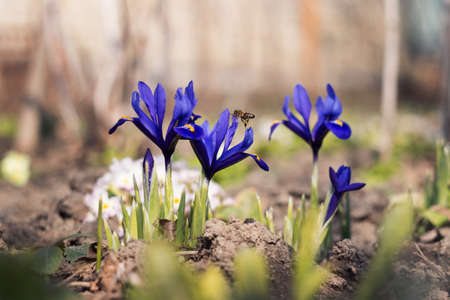 Bees pollinate bright blue stunted irises. Spring flowers, background