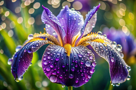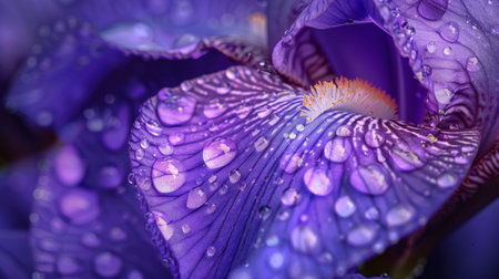 Close-up of dewdrops on the petals of a purple iris, highlighting its intricate details