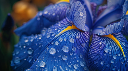Raindrops creating a mesmerizing pattern on the surface of a deep blue iris flower in a spring garden.