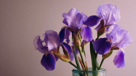 Elegant Purple Iris Flower in Modern Glass Vase with Copy Space