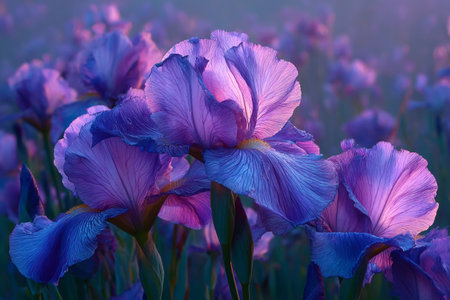 Twilight Irises. A serene field of irises blooming in vibrant purple and blue hues