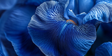 A macro view of deep blue iris petals, with a rich, velvety texture and intricate veining, highlighted by soft, natural light.