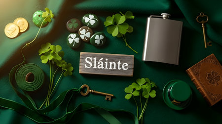 St. Patrick's Day theme with clover leaves, gold coins, horseshoe, metal flask, gold coins and green satin