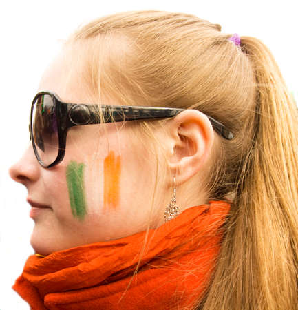 Back of tourist woman with a backpack admires the sunset and the flag of Ireland.