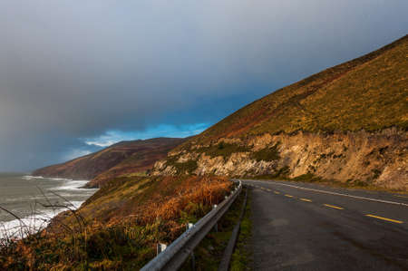 Scenic cloudy view over Atlantic coastline and road, Dingle peninsula, County Kerry, Ireland. Concepts: landscape, outdoor, tourism travel