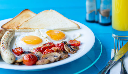 Breakfast of fried eggs, grilled sausages, fried mushrooms and cherry tomatoes and crispy toast on a white plate on a wooden blue table with a glass of orange juice.