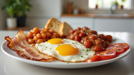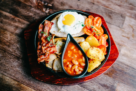 Delicious English breakfast with a fries egg, beans, bacon, and roasted potatoes.