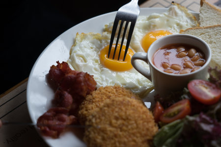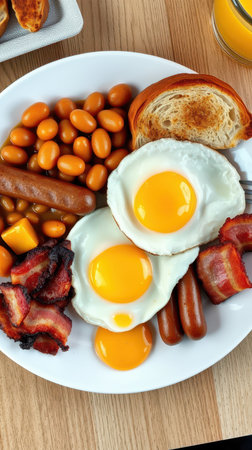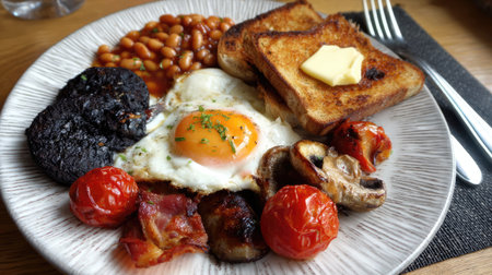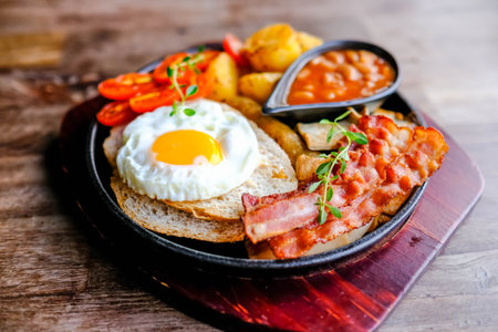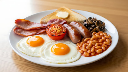 English breakfast with eggs, tomatoes, mushrooms, bacon, beans