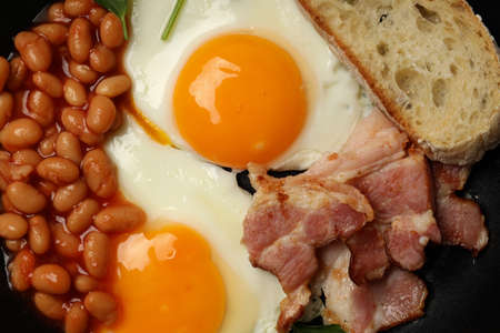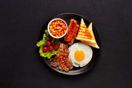 Traditional Full English breakfast, on a black background, fried eggs with fried bacon, sausages, white beans, cherry tomatoes, horizontal, no people ,. High quality photo