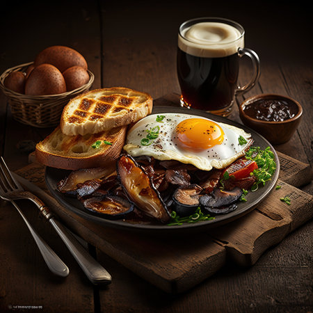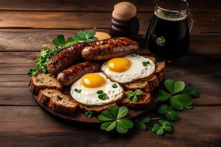 Traditional irish breakfast with sausages, eggs, and dark beer on rustic wooden table.