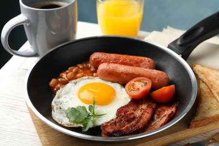 English breakfast in iron cooking pan with fried eggs, sausages, bacon, beaked beans, toasts, orange juice and black coffee on stone background.