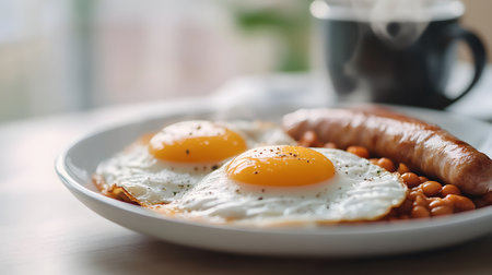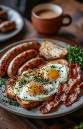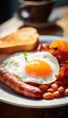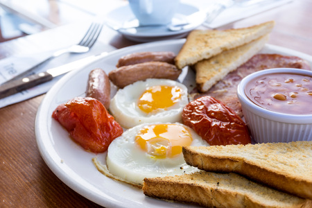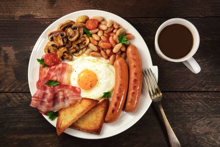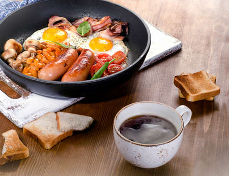 Full English breakfast with fried eggs, sausages, bacon, beans, toasts and coffee cup.
