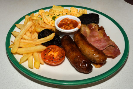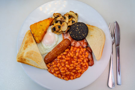 Full English fried breakfast with bacon, egg, sausages, black pudding, mushrooms, grilled tomatoes and baked beans.