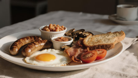 Full english breakfast with fried eggs, sausages, beans, and toasts is served on white tablecloth