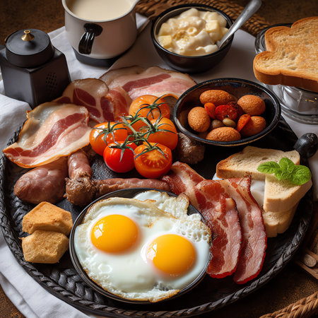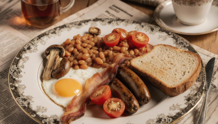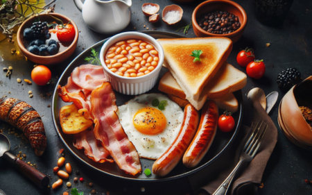 Traditional English breakfast with eggs, bacon, beans, toast, and tea on a dark background