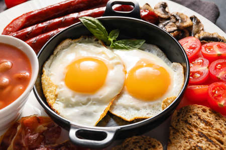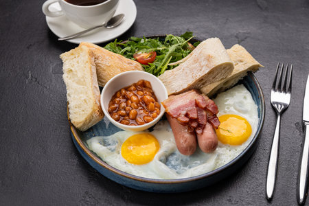 English breakfast with fried eggs, beans, grilled sausages and toasts