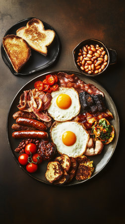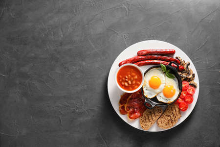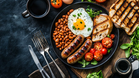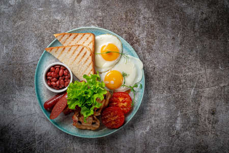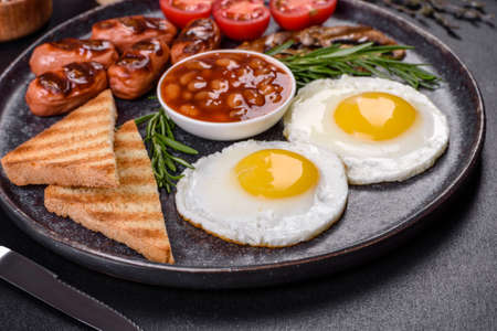Full english breakfast - bean, fried eggs, roasted sausages, tomatoes, mushrooms on a dark concrete table with toasted bread