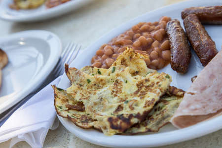 English breakfast with baked beans, omelettes, fried sausages and ham on hotel cafe terrace