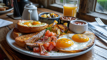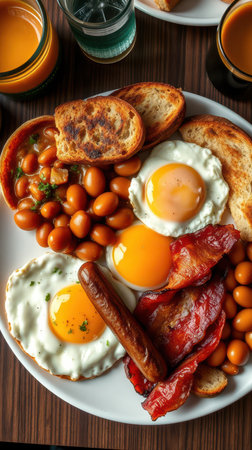 Full english breakfast - eggs, bacon, beans, toast, coffee and juice