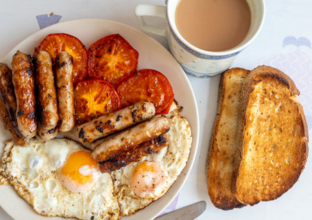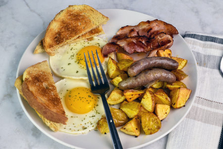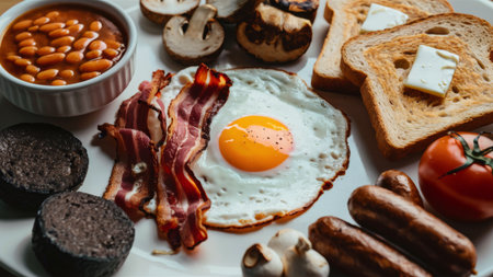 TRADITIONAL ENGLISH BREAKFAST WITH BUTTERED TOAST.TOP VEIW.selective focus